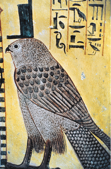 LEGENDA: DETALHE DE PINTURA MURAL DE UM FALCÃO REPRESENTANDO O DEUS HÓRUS. TUMBA DE SENNEDJEM, VALE DOS ARTESÃOS, EGITO, 1200 ANTES DE CRISTO. FIM DA LEGENDA.