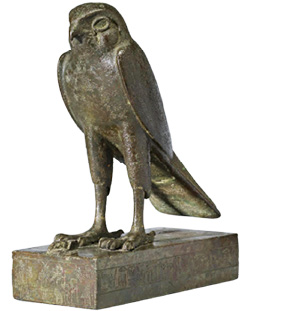 LEGENDA: ESTÁTUA DEDICADA AO DEUS HÓRUS, 600-350 ANTES DE CRISTO. BRONZE E OSSOS DE PÁSSAROS, ALTURA: 22,7 CM. MUSEU DE ARTE WALTERS, BALTIMORE, ESTADOS UNIDOS. FIM DA LEGENDA.