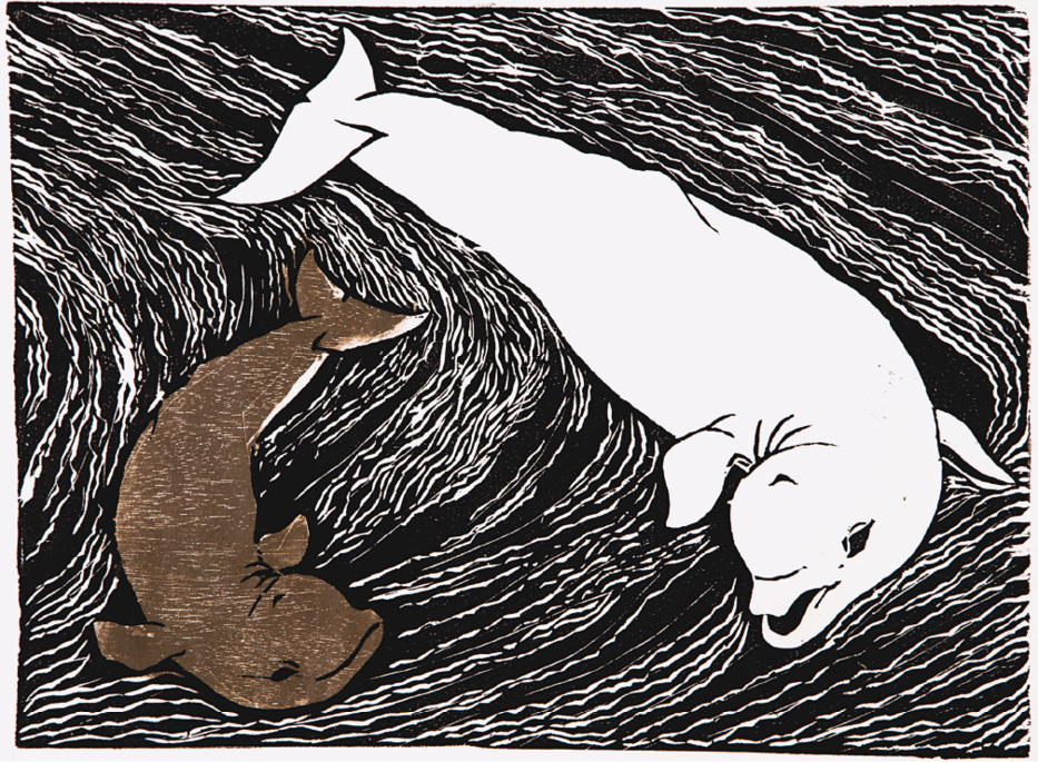 LEGENDA: BELUGA E SEU BALEOTE, 2012. ANGELA LEITE. XILOGRAVURA, 27 x 36 CM. COLEÇÃO PARTICULAR. FIM DA LEGENDA.
