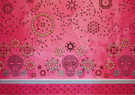 QUEM VÊ DE LONGE ESTE TRABALHO DA ARTISTA NORTE-AMERICANA JENNIFER ANGUS PERCEBE DESENHOS GEOMÉTRICOS, FLORES E CAVEIRAS NAS PAREDES.