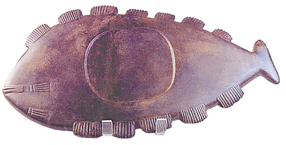 LEGENDA: ZOÓLITO EM FORMA DE PEIXE, SEM DATA. SAMBAQUI DE SANTA CATARINA, 42,5 x 25 CM. MUSEU NACIONAL. RIO DE JANEIRO, BRASIL. FIM DA LEGENDA.