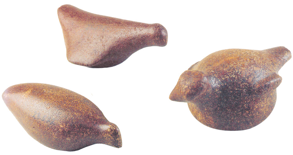 LEGENDA: ZOÓLITOS EM FORMA DE AVES, SEM DATA. SAMBAQUI DE SANTA CATARINA, 19 x 5 CM; 18,5 x 7,5 CM; 19,5 x 8,5 CM. MUSEU NACIONAL. RIO DE JANEIRO, BRASIL. FIM DA LEGENDA.