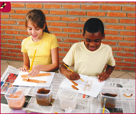 Explorem os diferentes tons e texturas da terra ao pintar. Não se esqueçam de lavar seus pincéis num pote com água antes de mudar de cor.