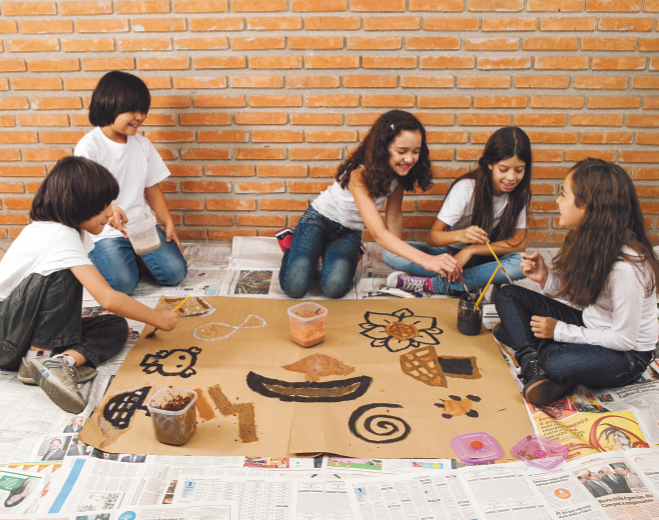 Agora, vamos reunir os materiais já coletados por vocês e fazer uma grande pintura usando as tintas de terra que prepararam.