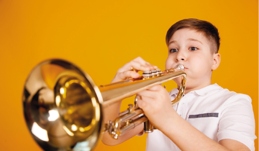 LEGENDA: Repare nas bochechas deste menino tocando trompete. Foto de 2018. FIM DA LEGENDA.