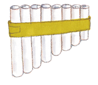 LEGENDA: Flauta de Pã feita de pedaços de tubos de PVC finos fechados com rolhas de cortiça e presos com fita adesiva. FIM DA LEGENDA.