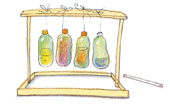 Um xilofone de água pode ser construído com garrafas plásticas preenchidas com quantidades variadas de água para emitirem diferentes sons ao serem tocadas.