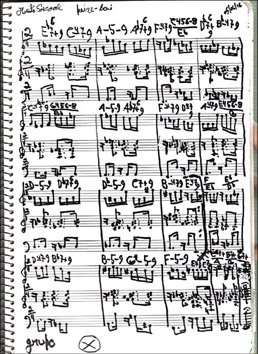 - Muitas partituras criadas por Hermeto Pascoal para registrar suas músicas foram feitas com notas musicais tradicionais, mas você também estudou uma que ele fez com: