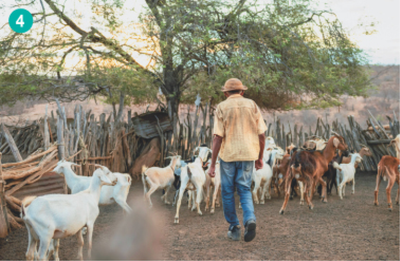 As pessoas estão cuidando de animais e de plantações (ao fundo).